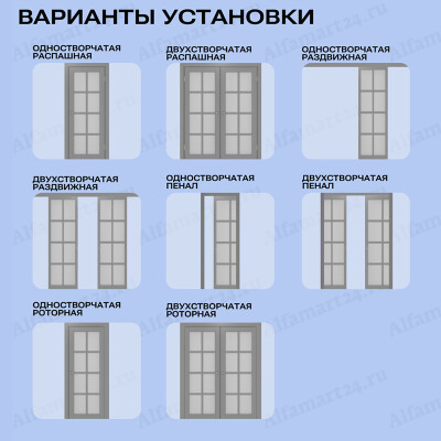 | Варианты установки (согласовывается с менеджером) | Раздвижной две створки, Раздвижной одна створка, Распашной две створки, Распашной одна створка | |