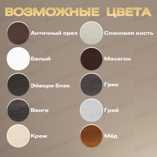 | Возможные цвета | Белый, Венге, Грей, Грис, Крем, Махагон, Мёд, Орех античный, Слоновая кость, Эйвори Блэк | |