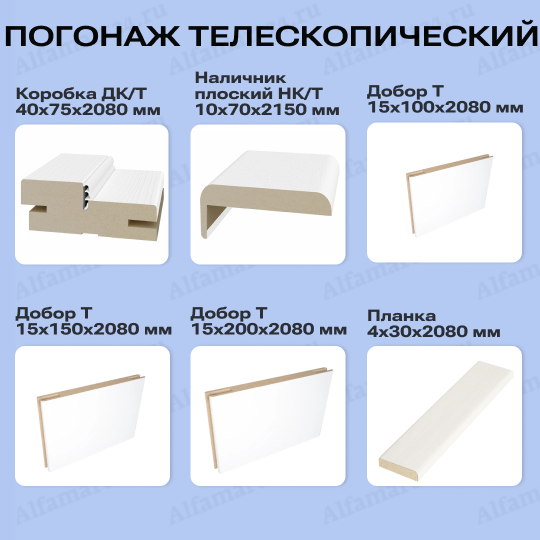 Дверной погонаж — это комплекс деталей, которые вместе образуют проем, в который в последствие устанавливается дверное полотно. Бывает двух типов телескопический и прибивной.