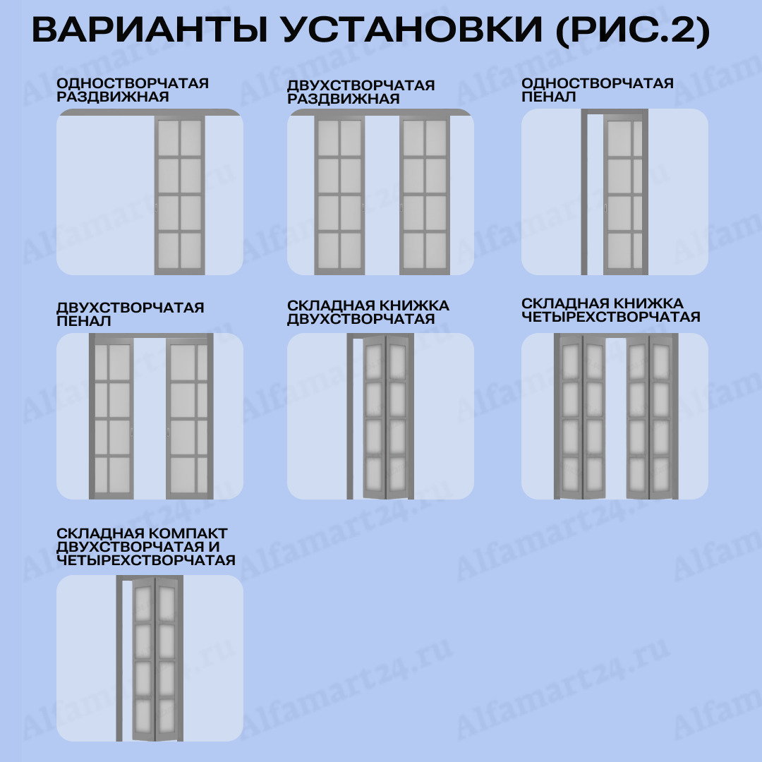 | Варианты установки (согласовывается с менеджером) | Раздвижной две створки, Раздвижной одна створка, Распашной две створки, Распашной одна створка | |