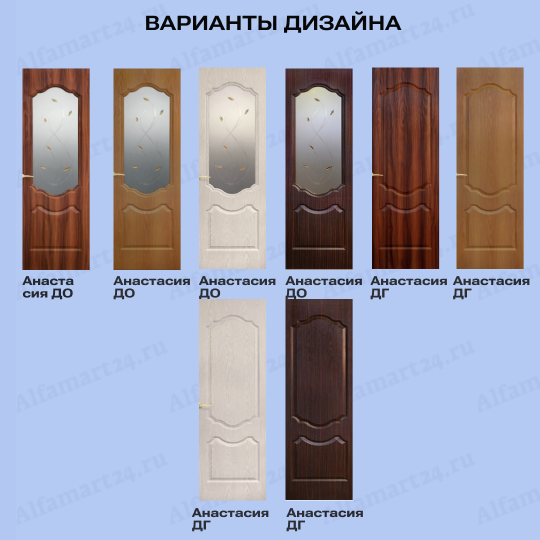 Двери возможно изготовить в большом разнообразии дизайнов. Популярными дизайнами являются двери с большим количеством стекла, либо со стеклом в половину или стеклом решеткой. Стоит обратит внимание на варианты дверей без стекла и с молдингом. Любой из перечисленных вариантов можно подобрать, посчитать и согласовать с нашими менежерами.